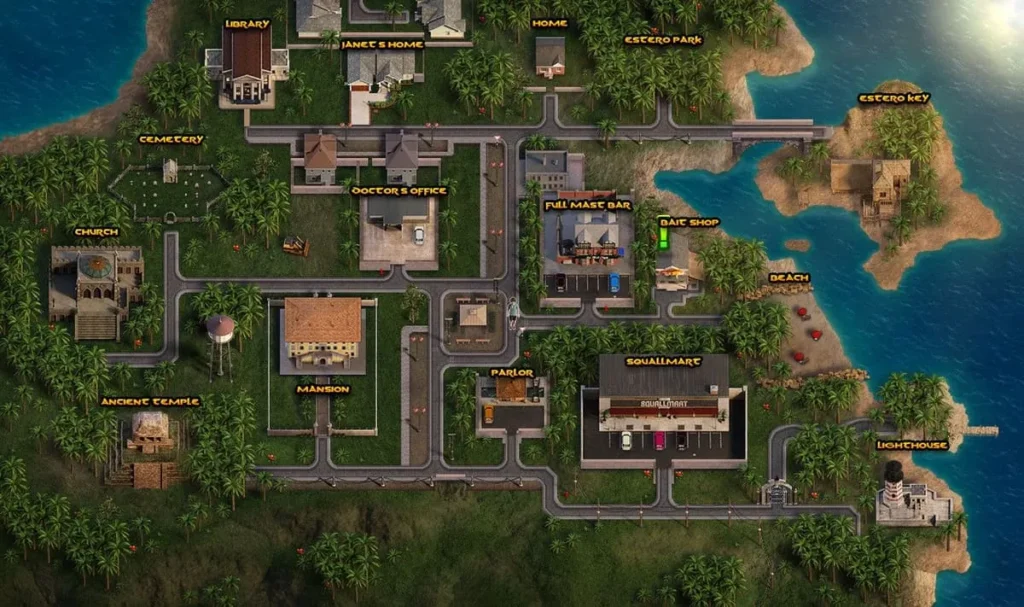 As a point and click adventure game, the world is your interactive canvas. You’ll split your time between familiar hubs like the bar, library, and supermarket, and wild, untamed locations like the dense jungle, winding beaches, and dark cave systems. Each location has a distinct mood and purpose. The bar is for gathering rumors and socializing, the library for research, and the wilds for direct exploration and discovery.